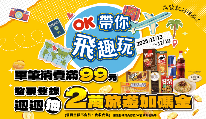 活動說明:於活動期間內,門市單筆消費滿99元含以上(消費不含菸、代收代售),即可憑購買發票至OK官網登錄發票週週抽2萬旅遊加碼金。(結帳折抵後金額需達99元,一張發票僅能登錄一次,逾其未登錄視同自動放棄抽獎權益)