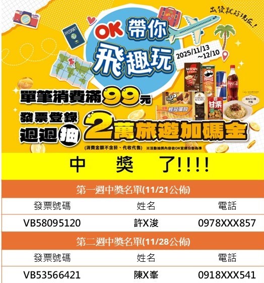 3.中獎者需於2025/12/19(五)前,將活動期間內購買發票正本(需可辨識購物明細)、領獎確認書正本(請中獎人自行下載填寫)、身分證正反影本及聯絡人姓名及電話一同寄回OK超商總公司-日本雙人機票抽獎活動小組收(110台北市信義區松德路97號B1),將統一聯繫寄回資料的中獎者,中獎者請自行影印留存發票資料,兌獎寄回日期以郵戳為憑,逾期或寄回資料不齊全將視同放棄中獎資格,主辦單位將不另行通知。使用無實體電子發票(無列印紙本電子發票/手機條碼電子發票/非手機條碼電子發票)消費者,電子發票儲存於雲端發票平台,可至【財政部電子發票整合服務平台】查詢與印發票號碼及明細。清楚拍攝或擷取中獎的電子發票及符合活動辦法之銷售明細之詳細畫面,將發票明細正本紙本或其列印為紙本寄送提供於本活動小組。