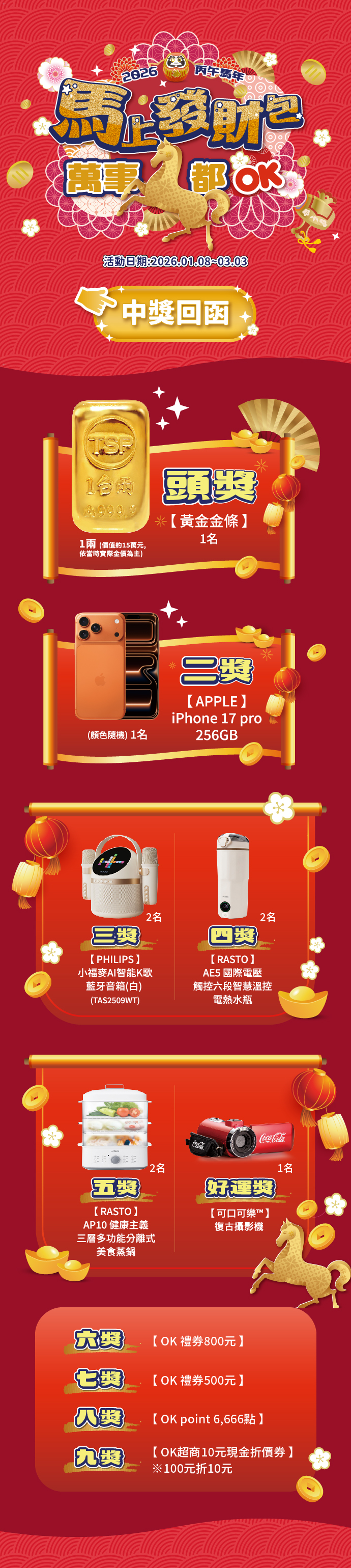 頭獎:黃金1兩-1名,中獎機率0.004%;二獎: Apple iphone17 pro 256GB(顏色隨機)-1名,中獎機率0.004%;三獎: PHILIPS 小福麥AI智能K歌藍牙音箱(白)-TAS2509WT-2名,中獎機率0.008%;四獎: RASTO AE5 國際電壓觸控六段智慧溫控電熱水瓶 -2名,中獎機率0.008%;五獎: RASTO AP10 健康主義三層多功能分離式美食蒸鍋-2名,中獎機率0.008%;六獎: OK禮券800元-2名,中獎機率0.008%;七獎: OK 禮券500元-3名,中獎機率0.012%;八獎: OK point 6,666點-100名,中獎機率0.4%;九獎: OK超商10元現金折價券-24906名,中獎機率99.54%;好運獎: 可口可樂®復古攝影機-1名,中獎機率0.004%。刮刮卡若破損、影印、無法辨識或其它情形,至不可辨認真偽者,視同無效。如仿冒、變造或以違法途徑取得本刮刮卡者,除不得兌換獎品外,OK超商將保留法律追訴權。