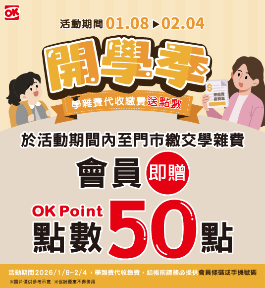 繳學雜費可贈50點OK會員點數