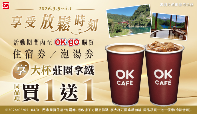 購買住宿券/泡湯券享大杯莊園拿鐵買1送1